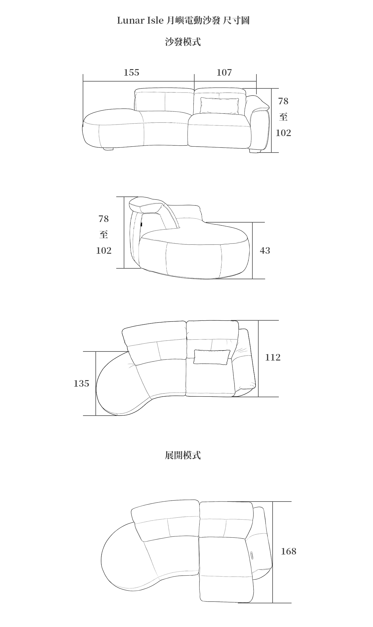 寬262cm X 高78至102cm X 深112cm